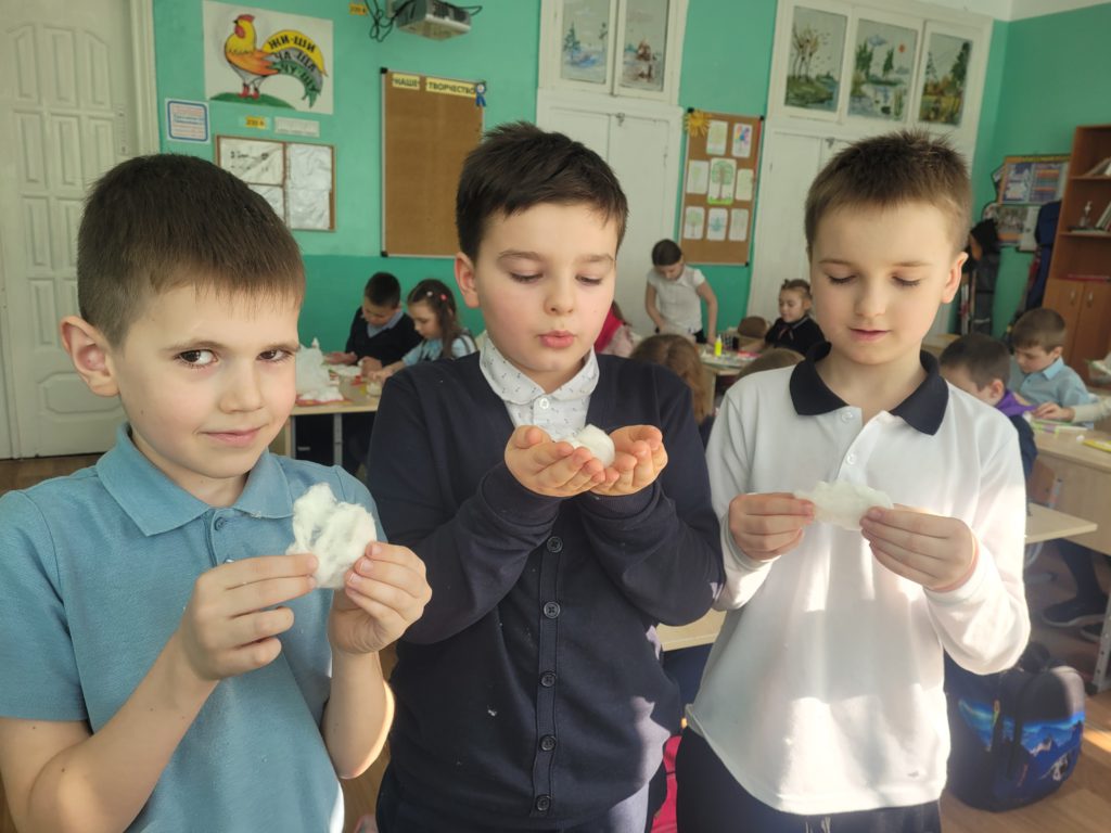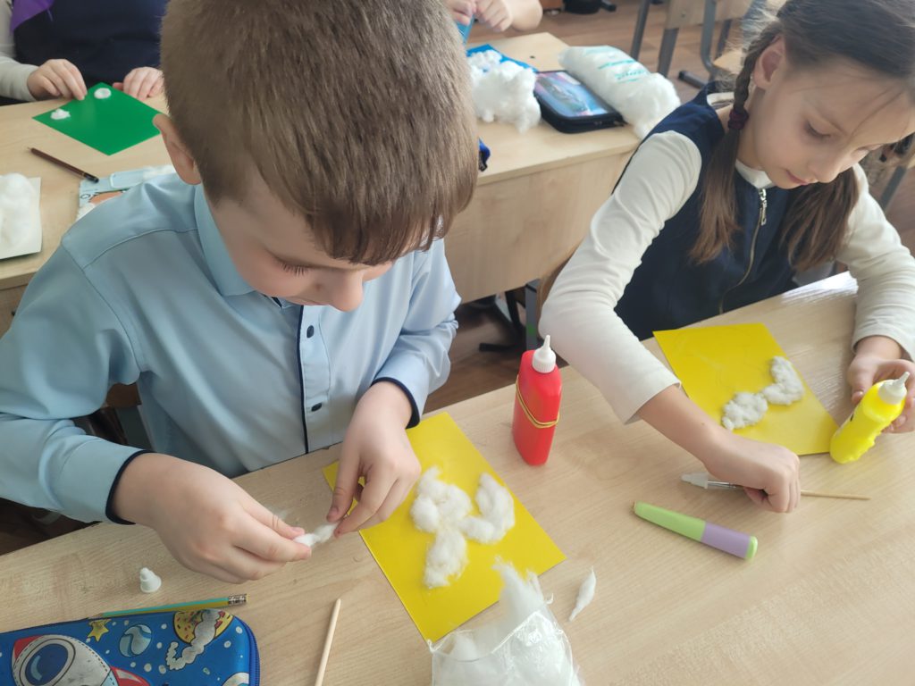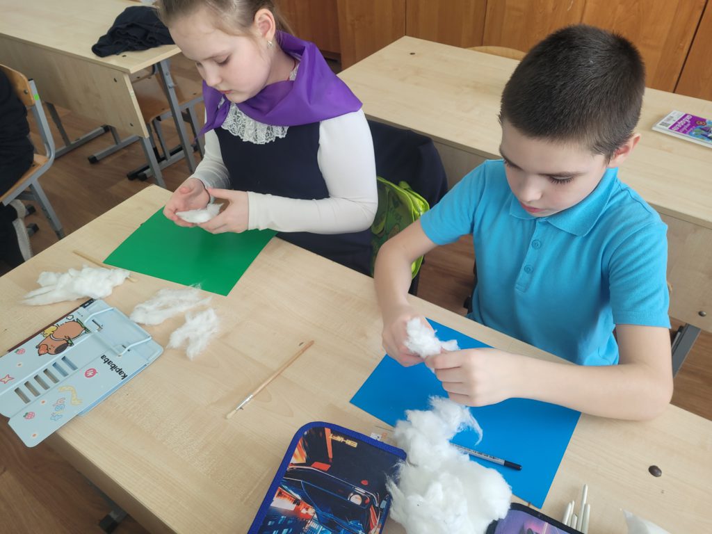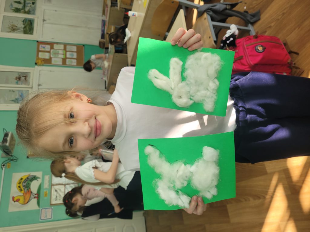 На неделе экспериментов изучали новый материал – вату. Сначала поговорили, где используется. Потом изучали свойства ваты: трогали, растягивали, отрывали кусочки, крутили шарики, мочили в воде и делали выводы. В заключении занятия своими руками создали аппликацию с помощью этого пушистого материала. Познавательно и интересно. Эксперименты продолжаются!