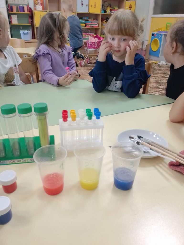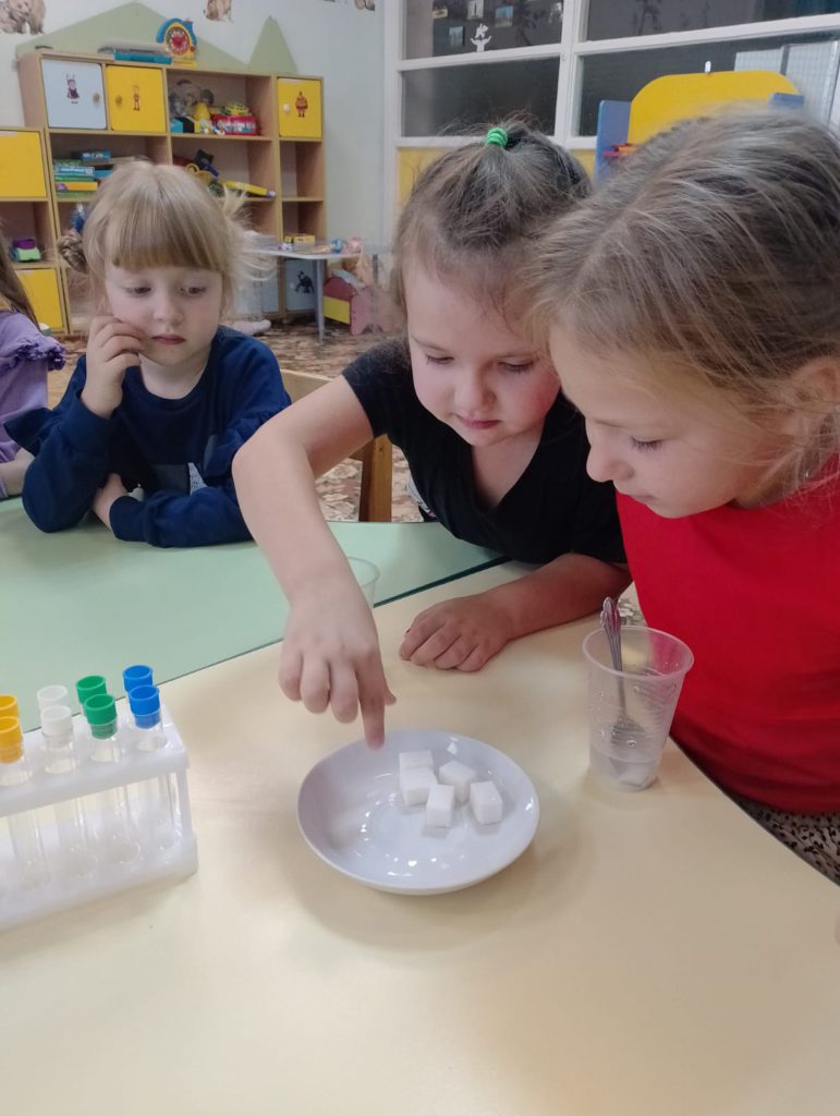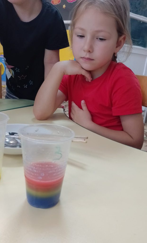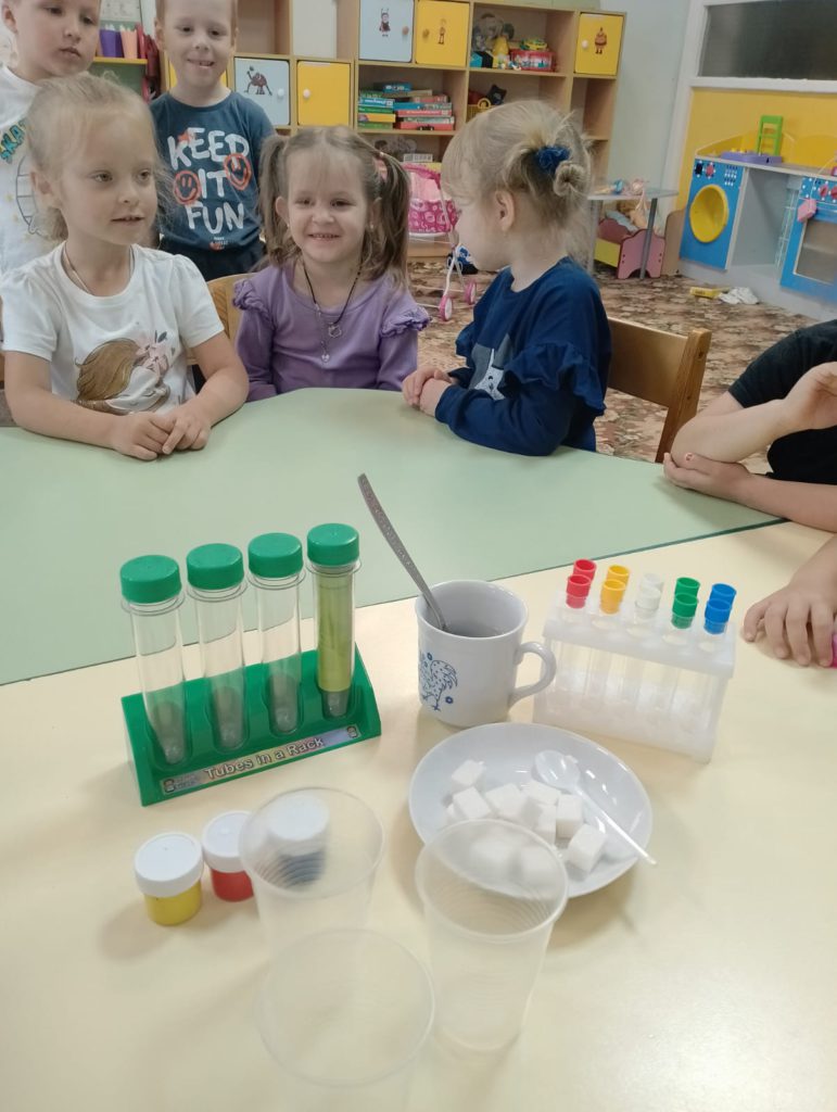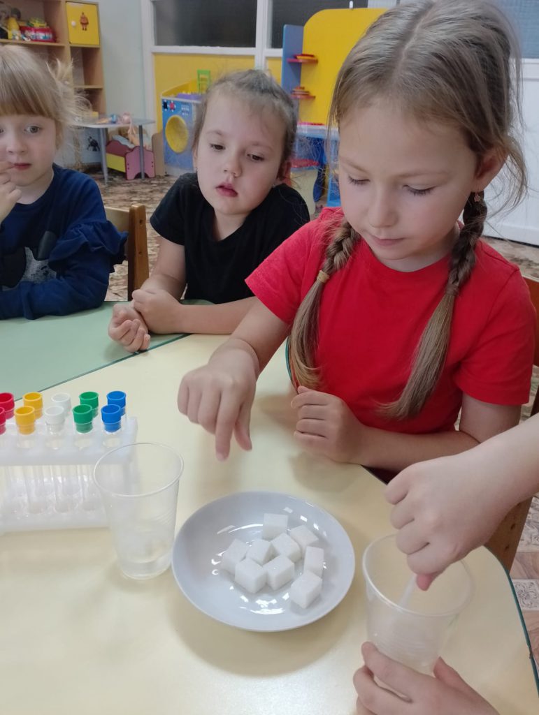 В рамках реализации проекта “Предшкола: стандарт детского сада” На тематической неделе ” Творческая лаборатория” у детей старшей группы прошло занятие: “Учимся творить и экспериментировать (Опыты с водой)